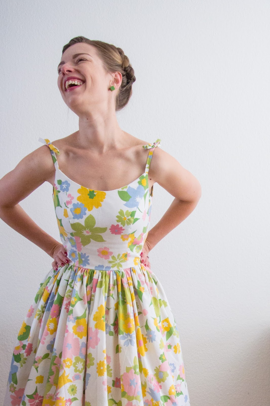 Fabric: a vintage, dead stock sheet. I purchased quite a few in-package sheets years ago at an estate sale and have been hoarding them since! I knew right away that this fabric needed to be matched with this dress when I was considering options in my fabric stash. It's a woven, 50% cotton 50% polyester poplin; a little sheer due to the white background, but not too lightweight.